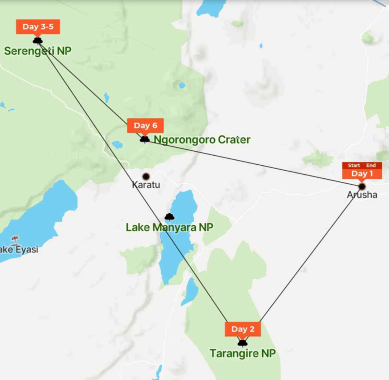 After a beautiful breakfast at your accommodation in the Serengeti, with your packed picnic boxes, you will be driving straight to Ngorongoro crater for the full day game drive inside the Ngorongoro crater, The Ngorongoro Conservation Area is the largest unbroken, unflooded volcanic caldera in the world. It is a scenic showstopper that extends across an astonishing 260 square kilometres. The crater is hemmed in on all sides by sheer craggy walls that rise up to 600m above the floor. The view from the lushly forested rim is utterly stupendous and would justify a visit to Ngorongoro in its own right. But this spectacular crater also stands as one of Africaโs most alluring safari destinations, supporting solid populations of all of the Big Five (elephant, lion, leopard, black rhino and buffalo), plus a host of other iconic large mammals, in a lush and scenic landscape that frequently draws comparisons to the metaphorical โGarden of Edenโ. After crater tour, ascend the crater to Arusha.