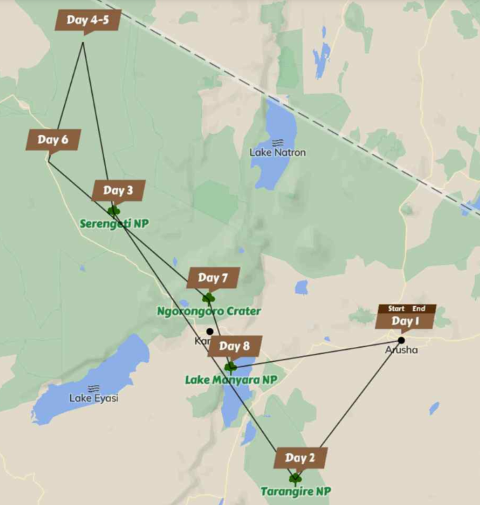 The northern tourism circuit is by far the most popular safari circuit in Tanzania, comprising most of the must-see destinations in the country. If you’re a first-time visitor to Tanzania, this is where you want to be. This 8 days Tanzania experience will give you the test of Tanzania cultural diversity and wildlife experienceat once, will take you the home of ย Elephant, Tarangire National park and then youโll visit the Serengeti, the Big 5 game haven and also the host of over 3 million large mammals. Then, youโll go to Ngorongoro Crater which supports a year-round resident population of mammals and finally, youโll head to Lake Manyara National Park, an ornithologistsโ paradise known for its elusive tree-climbing lions as well as the endless plains of the Serengeti. Youโll stay luxury lodges & tented camps.